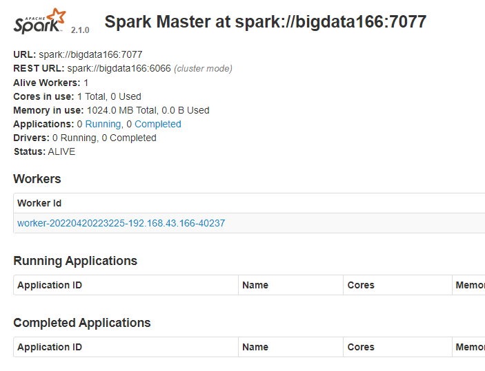 配置文件:conf/spark-env.sh export JAVA_HOME=/opt/module/jdk1.8.0_144 export SPARK_MASTER_HOST=bigdata166 export SPARK_MASTER_PORT=7077 # 下面的可以不写,默认 export SPARK_WORKER_CORES=1 export SPARK_WORKER_MEMORY=1024m